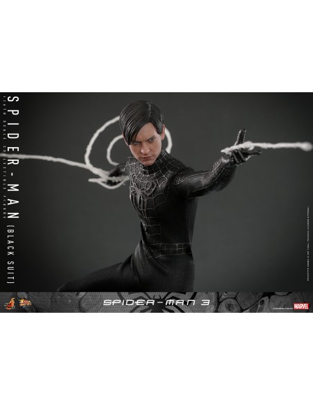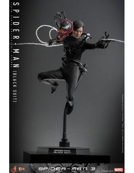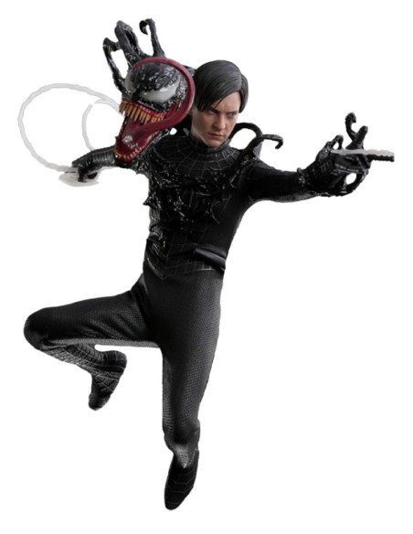 Realizzata con cura basandosi sull'aspetto di Tobey Maguire nei panni di Spider-Man / Peter Parker con il costume nero in Spider-Man 3, la statuetta in scala 1/6 presenta una scultura della testa di nuova concezione con sistema di occhi rotanti separato, una testa con maschera intercambiabile; un corpo ampiamente snodabile per pose dinamiche; una fedele riproduzione del costume nero con motivi a ragnatela argentata in rilievo; Accessori come braccia e testa di simbionte alieno con lingua sporgente, maschera di Spider-Man, accessori assortiti per ragnatele e una base espositiva a tema.