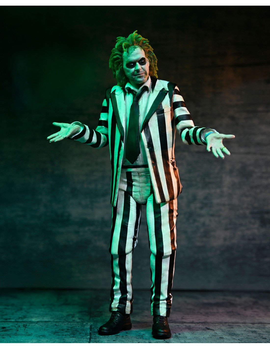 Beetlejuice indossa il classico vestito a righe bianche e nere ed è dotato di articolazioni e accessori: teste e mani intercambiabili, volantino e Baby Beetlejuice!