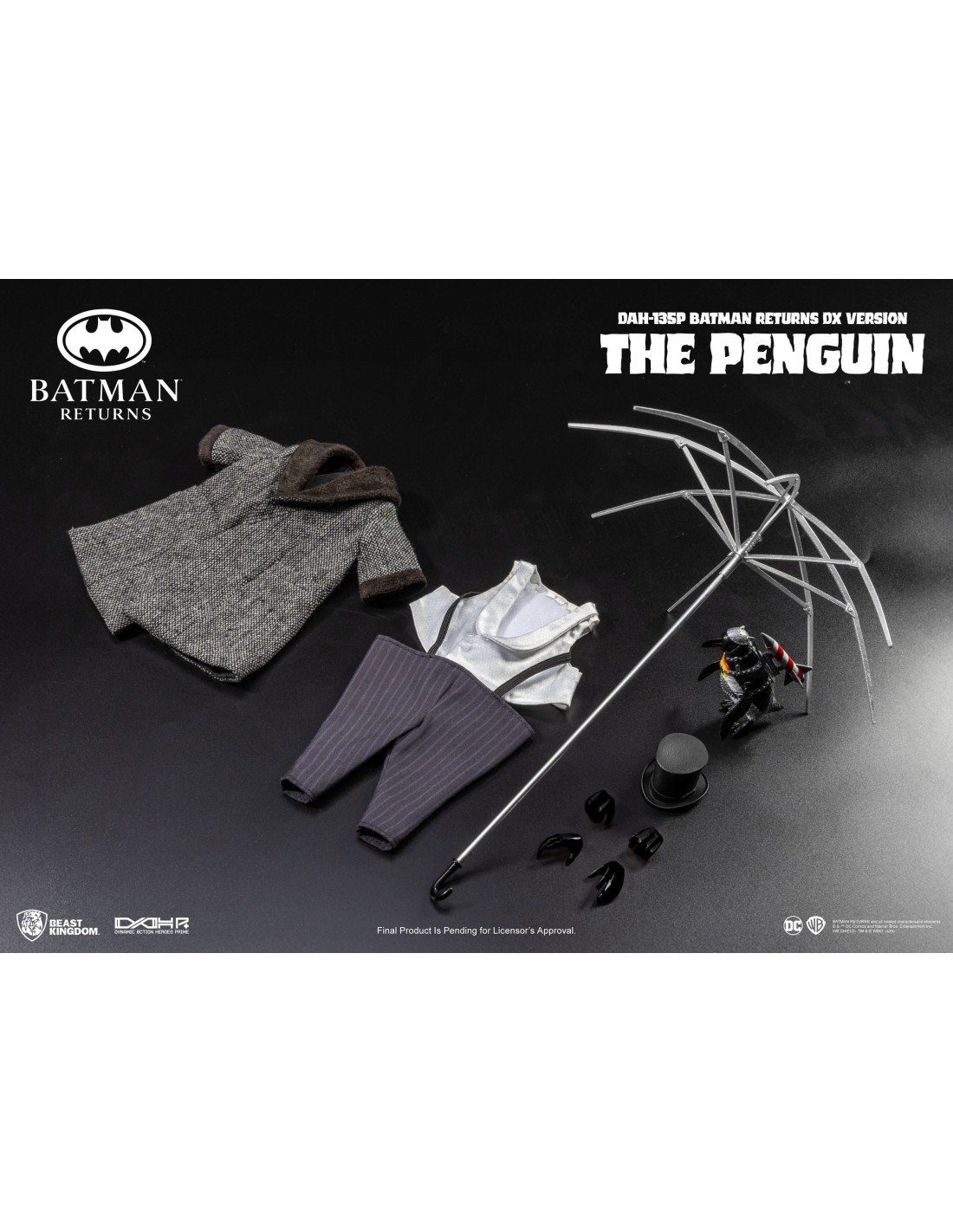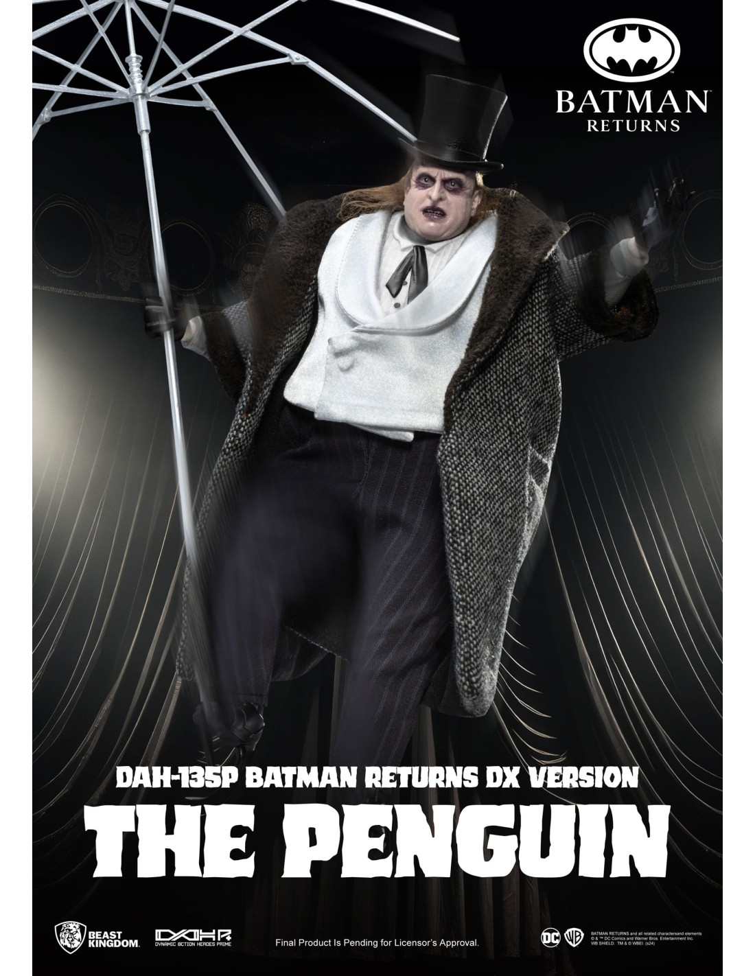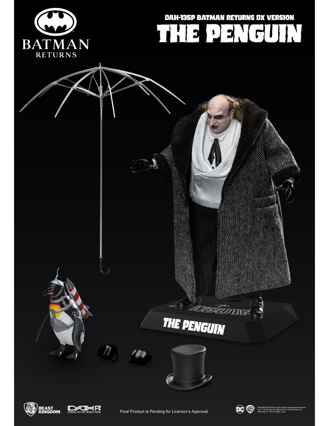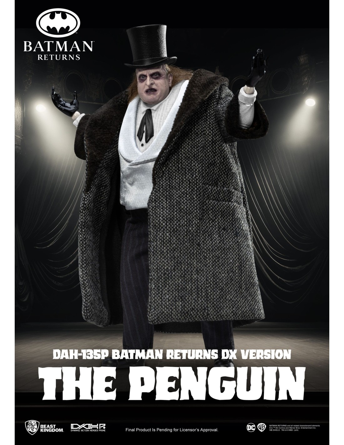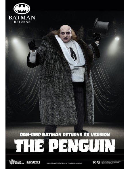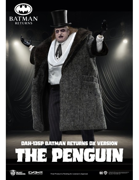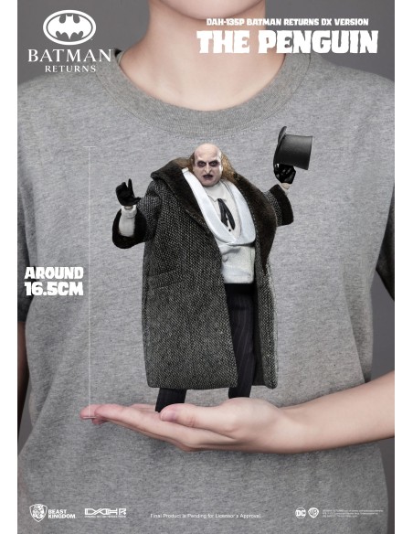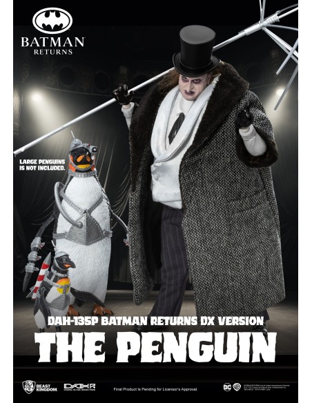 La The Penguin DX DAH-135P di Beast Kingdom, ispirata a Batman Returns, è una figure deluxe altamente dettagliata con abiti in tessuto e accessori iconici. Basata sull’interpretazione di Danny DeVito, include cappello, ombrello, mini pinguino armato e mani intercambiabili. Limitata a 3000 pezzi con certificato, è una scelta premium per collezionisti DC.