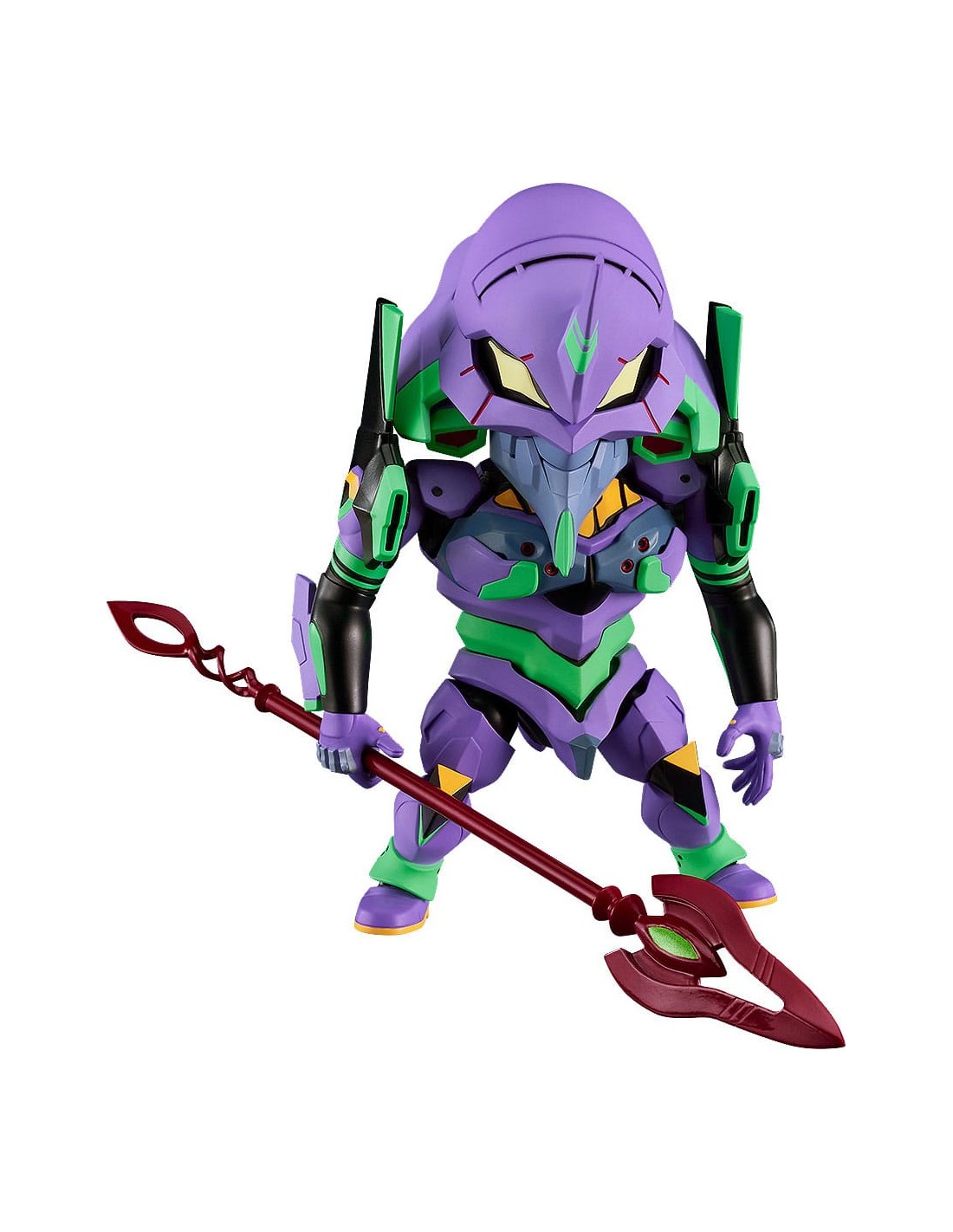 A differenza delle classiche figure realistiche, questa versione Nendoroid trasforma l’EVA-01 in uno stile chibi compatto, mantenendo però tutti gli elementi distintivi del design originale: colorazione viola e verde, testa iconica e proporzioni riconoscibili.
