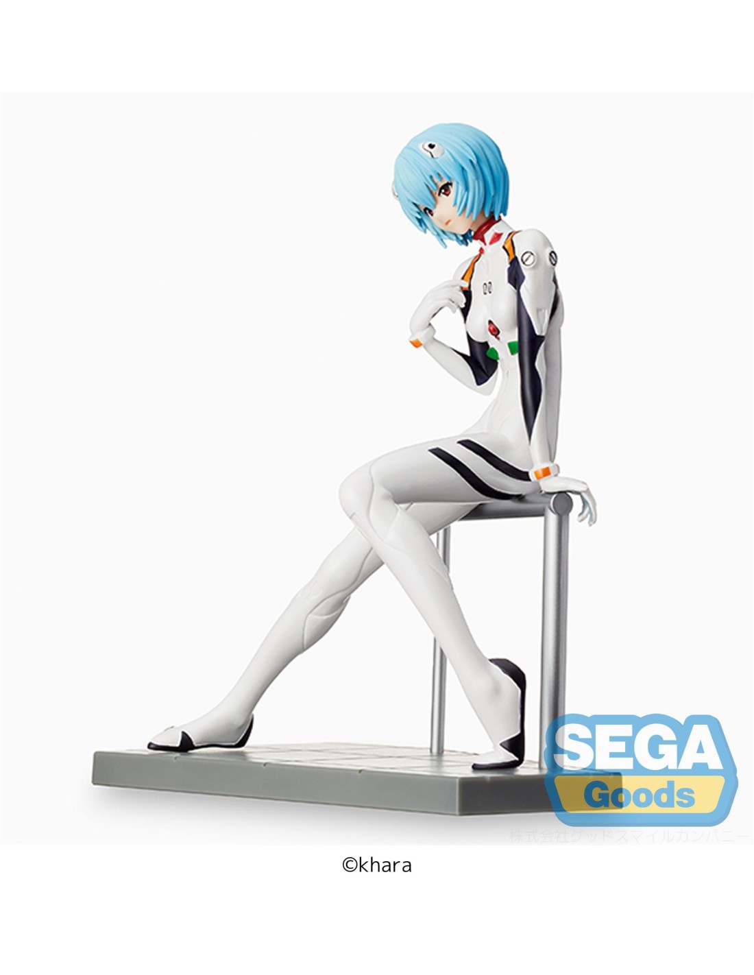 Rei Ayanami in plug suit, raffigurata in una posa seduta semplice ma elegante.