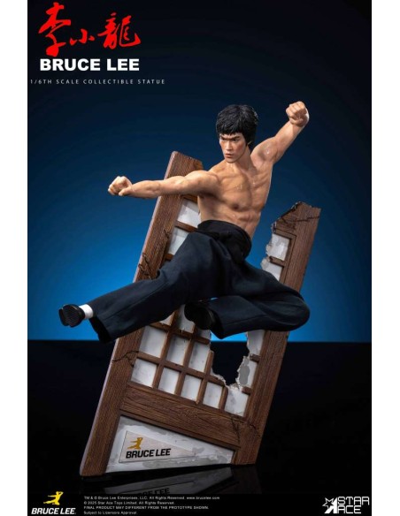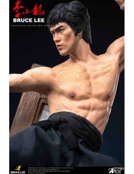 Bruce Lee è vestito con pantaloni di stoffa, aggiungendo un tocco di autenticità che aumenta il realismo complessivo del pezzo. La posa dinamica, combinata con il design suggestivo, racchiude perfettamente l'intensità e la potenza della sua abilità nelle arti marziali.
