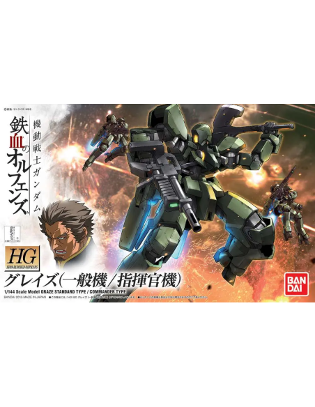 Il Bandai Graze Standard/Commander Type HG 1/144 è un model kit Gunpla ispirato alla serie anime Mobile Suit Gundam: Iron-Blooded Orphans. Precolorato e snap-fit, permette di assemblare facilmente sia il modello Standard che quello Commander, offrendo dettagli realistici e articolazioni dinamiche per collezionisti e fan Gundam.