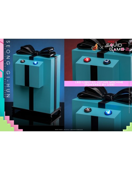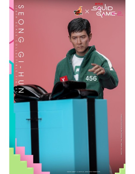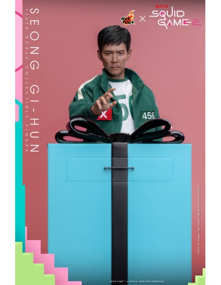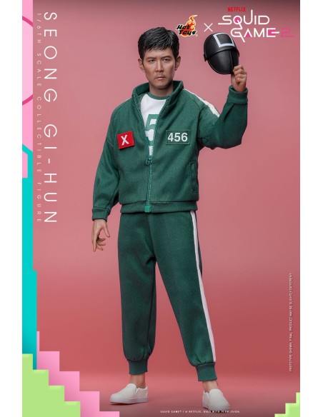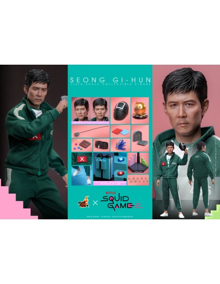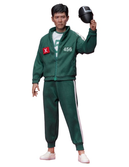 La figura d'azione in sesta scala estremamente precisa è magistralmente realizzata in base all'aspetto di Lee Jung-jae nei panni di Seong Gi-hun in Squid Game, con una scultura della testa di nuova concezione con bulbi oculari rotanti separati e un corpo di nuova concezione che è abbinato a una tuta da gioco Squid Game fedelmente realizzata con ricamo n. 456 e dettagli del distintivo con il segno della croce. Oltre a Seong Gi-hun, nel gioco Squid è inclusa una serie di accessori: una macchina per il voto alimentata tramite USB, un salvadanaio, un accessorio per maschera con il simbolo del quadrato, un set per il gioco del pentathlon a sei gambe composto da un paio di cavigliere, un paio di Ddakji, un paio di Biseokchigi, un set di pietre Gonggi, un volano, una trottola e una speciale base per la figura progettata per riprodurre l'ambientazione della scalinata.