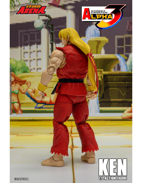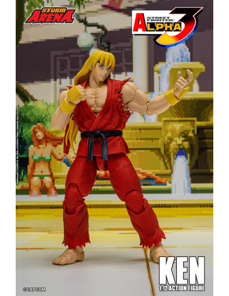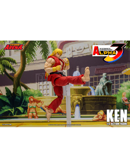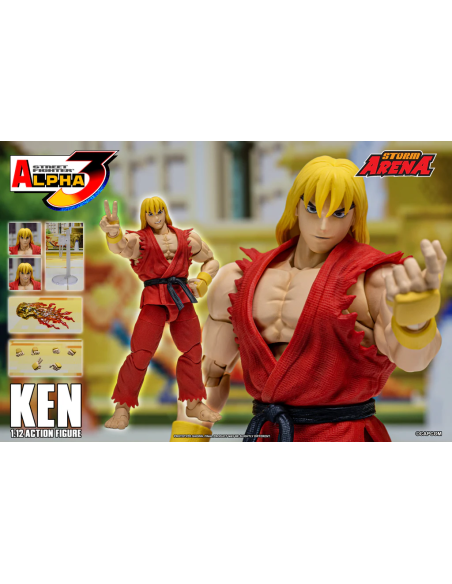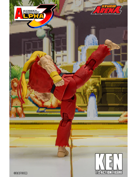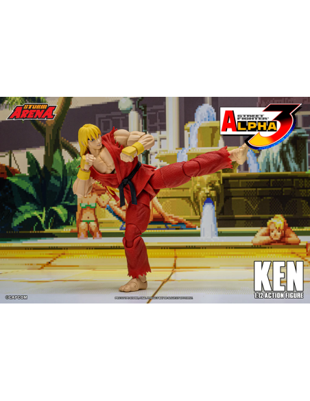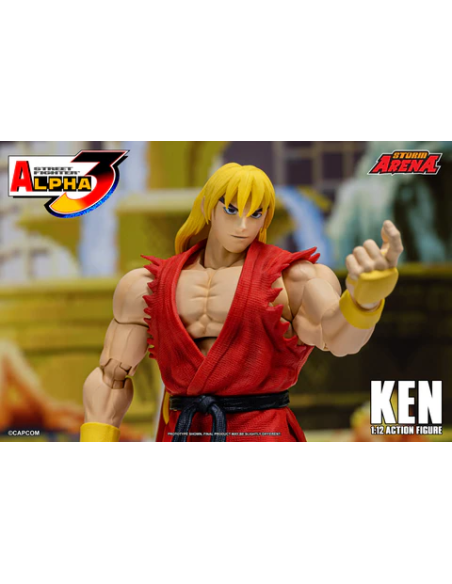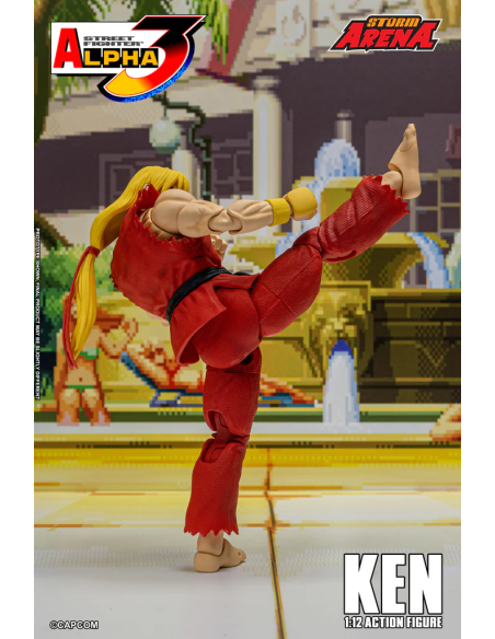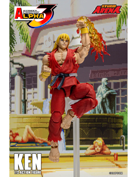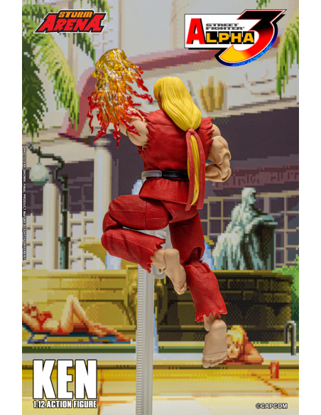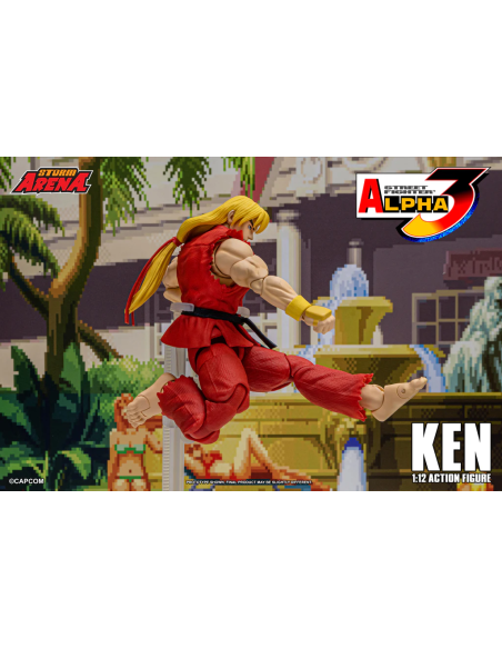 Ken da Street Fighter Alpha 3 Figura in scala 1/12 alta 15 cm, nella confezione troverete una base espositiva, 3 paio di mani intercambiabili , 1 effect part infuocato e 3 teste intercambiabili