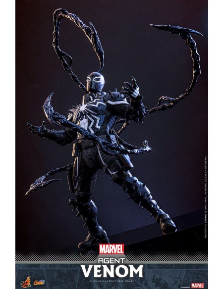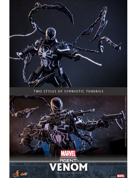 Realizzata meticolosamente in base ai fumetti Marvel, l'action figure dell'Agente Venom presenta una testa scolpita di recente con oculari intercambiabili, un corpo specializzato che ritrae naturalmente il fisico muscoloso dell'Agente Venom, un'armatura simbiotica con punte che mostrano un tema militare, un avambraccio con lama simbiotica intercambiabile, due stili di viticci attaccabili alla schiena della figura, due fili di accessori in fettuccia, una serie di armi da fuoco tra cui fucile da cecchino, mitragliatrice, mitragliatrici, pistole e, infine, una base per figura appositamente progettata con il nome del personaggio.