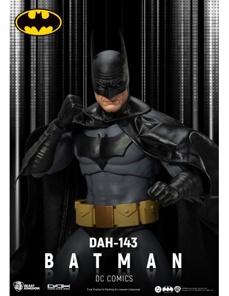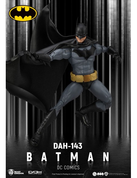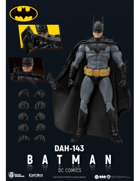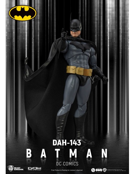 La action figure DAH-143 cattura lo sguardo intenso di Batman sotto il cappuccio, con una scultura dettagliata del viso e del fisico muscoloso. Indossa una tuta da combattimento grigia con cintura gialla, guanti neri, stivali e un mantello in tessuto pregiato con ferretto interno per pose dinamiche.