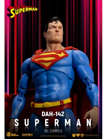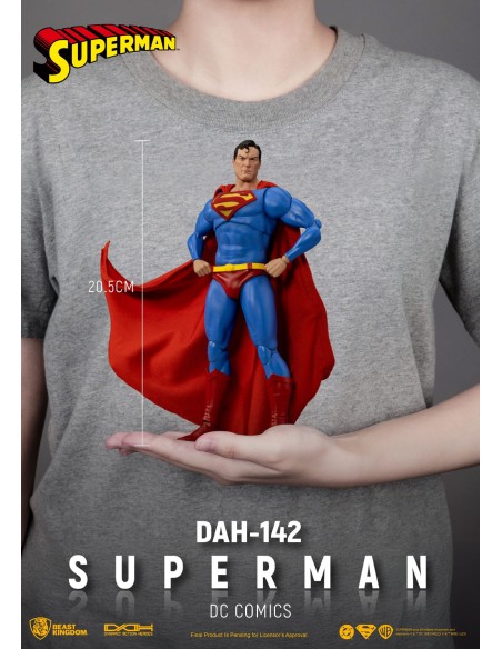La action figure DAH-142 sfoggia l'iconico look di Superman con una testa meticolosamente scolpita, il suo inconfondibile sguardo determinato e il classico costume blu con dettagli rossi e gialli. Il famoso scudo a S sul petto e il mantello rosso in tessuto con struttura interna in filo metallico completano la sua eroica presenza.
