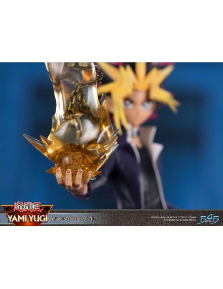 La statua riproduce meticolosamente le caratteristiche iconiche di Yami Yugi, dai capelli tricolore allo sguardo penetrante, fino all'uniforme Domino High con colletto chiuso e fibbia. È raffigurato in piedi, sicuro di sé, con la mano destra che regge un Puzzle del Millennio, da cui emana un effetto di energia gialla trasparente. La base è decorata con l'Occhio di Anubi dorato che si staglia su uno sfondo blu.