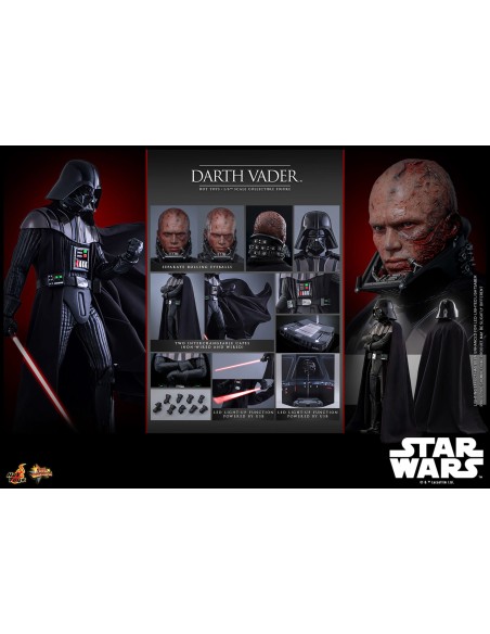 L'action figure di Star Wars presenta un casco di nuova concezione e una scultura della testa estremamente accurata, danneggiata in battaglia, una tuta e un'armatura nere finemente confezionate, e un pannello toracico e una cintura illuminati a LED, tutti replicati fedelmente per riflettere l'aspetto di Vader nel film. Con oltre 30 punti di articolazione e una selezione di mani intercambiabili, i collezionisti possono posizionare Vader in diverse pose che ne mettono in risalto la presenza imponente. Include inoltre spade laser, una base illuminata a LED a tema stazione spaziale e uno sfondo.