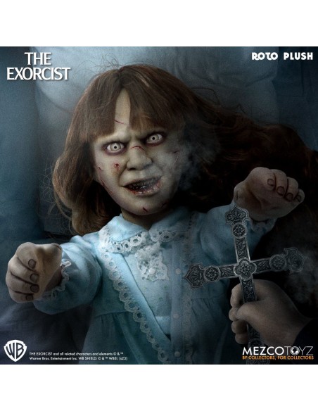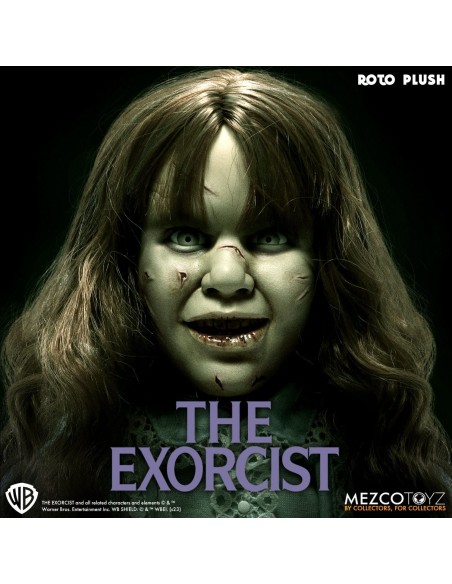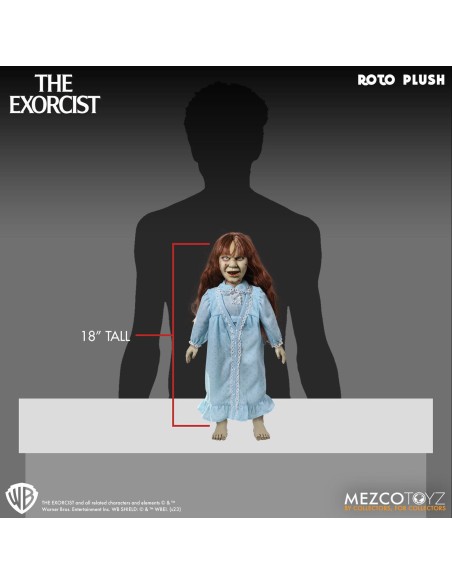 Il diavolo è nei dettagli! Regan indossa la sua caratteristica camicia da notte blu e presenta tratti incredibilmente realistici che catturano la sua espressione demoniaca: occhi ingialliti, pelle screpolata e un ghigno diabolico. È alta circa 46 cm e presenta parti scolpite su un morbido corpo di peluche.