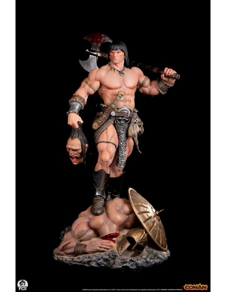 La scultura presenta dettagli incredibili, dalle armi e armature riccamente decorate alle texture realistiche delle sue vesti e degli accessori in pelliccia. La statua di Conan include anche una mano destra intercambiabile che regge la testa appena rimossa del barbaro avversario.