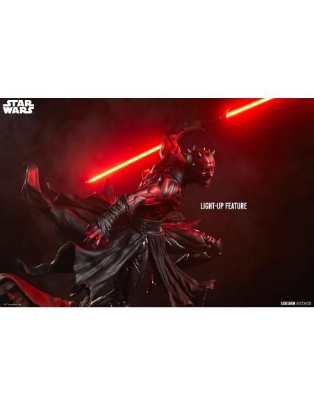 Questo Darth Maul da collezione in polystone presenta un costume completamente scolpito composto da gonne nere consumate dal tempo, cinture, bracciali e un colletto nero. In seguito al suo fatale duello con Obi-Wan Kenobi, il cattivo dathomiriano ora possiede potenti gambe robotiche altamente dettagliate che gli permettono di cacciare le sue prede con precisione animalesca. Il ritratto di Darth Maul mostra una smorfia e delle corna corte, ed è anche ricoperto dai consueti segni Zabrak, che gli conferiscono il suo caratteristico aspetto rosso e nero. Questa dinamica statuetta di Star Wars include una spada laser, che illumina l'inimicizia di Maul da ogni angolazione.