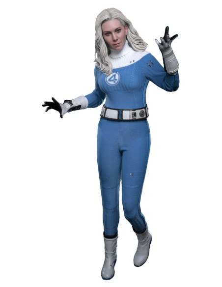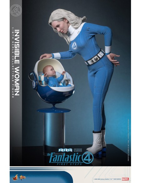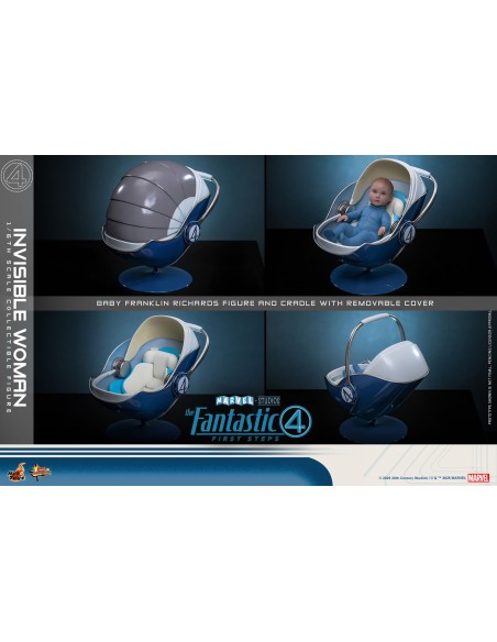 Sideshow e Hot Toys sono orgogliose di presentare la statuetta da collezione in scala 1/6 della Donna Invisibile. La action figure presenta una testa di nuova concezione con occhi rotanti e capelli biondo ghiaccio meticolosamente scolpiti per riflettere le sembianze di Vanessa Kirby. Indossa la sua uniforme retrò-futuristica dei Fantastici Quattro con cintura e stivali coordinati. La action figure offre nove mani intercambiabili, sia con guanti che senza, che permettono ai collezionisti di mostrarla in pose rilassate o in pose che ne evidenziano le abilità. Gli accessori includono un effetto campo di forza olografico traslucido per ricreare i suoi scudi energetici, un piccolo Franklin Richards con arti leggermente articolati e adagiato in una culla coperta da un coperchio rimovibile, e un supporto per action figure appositamente progettato.