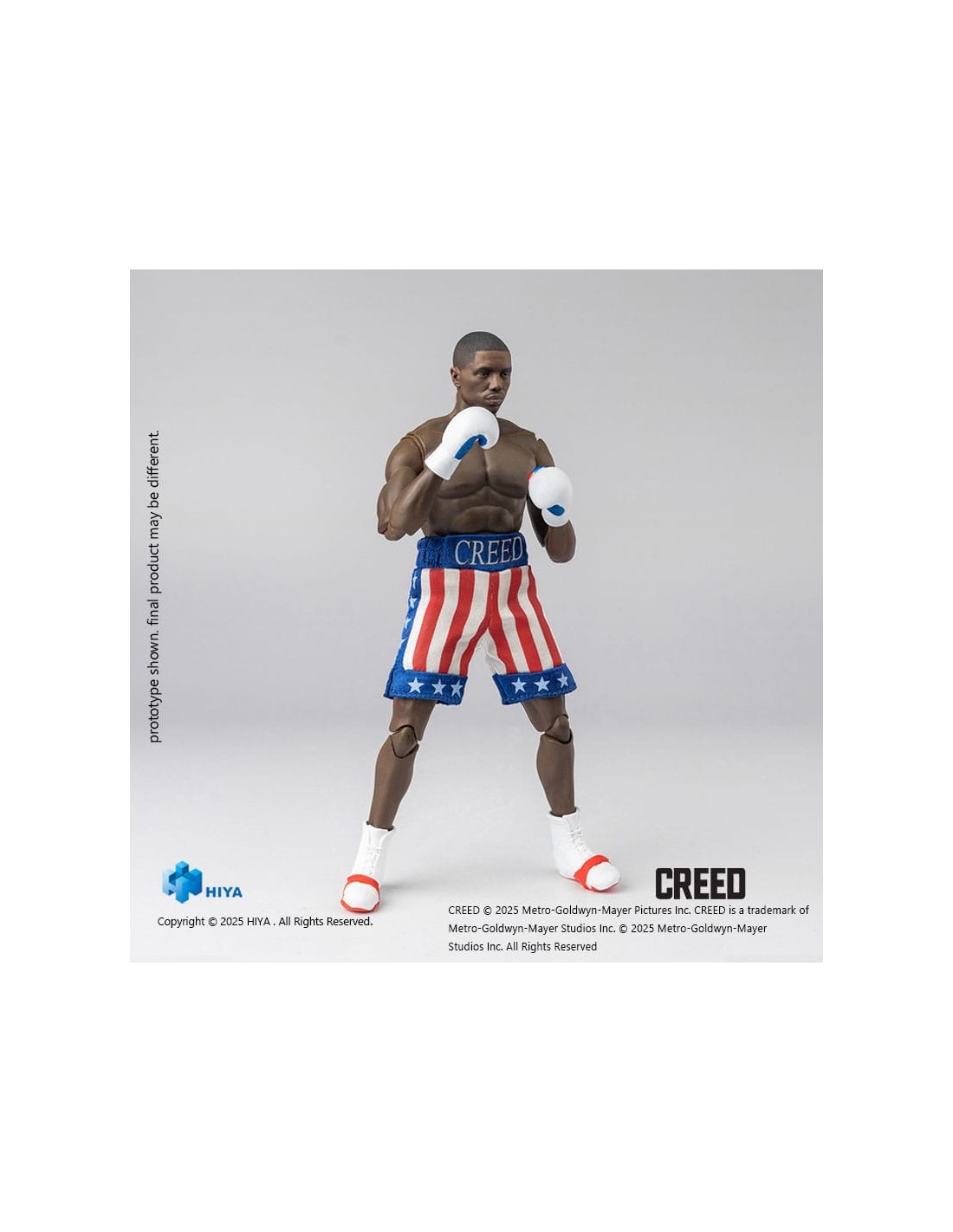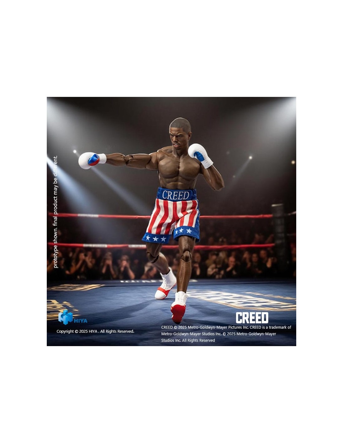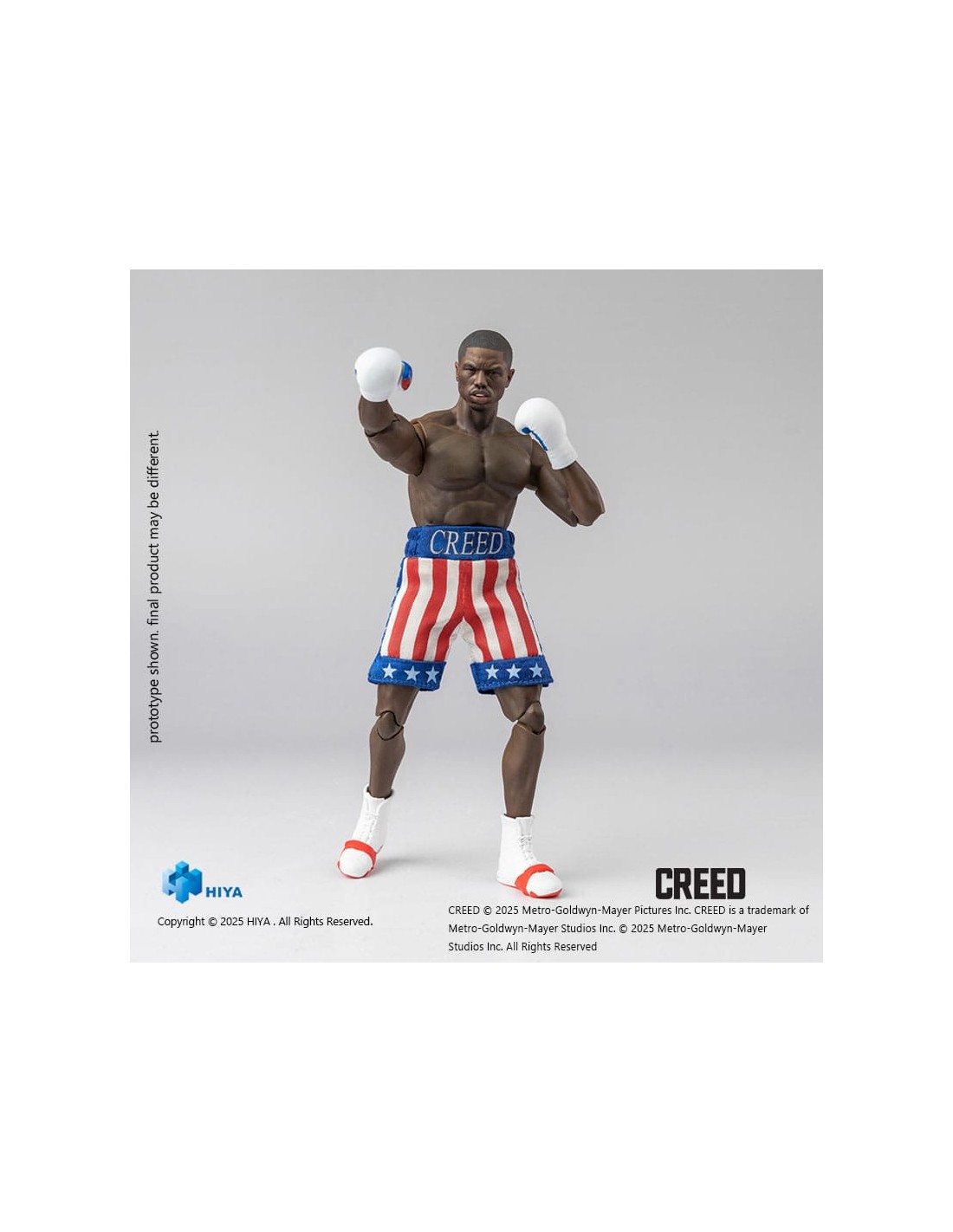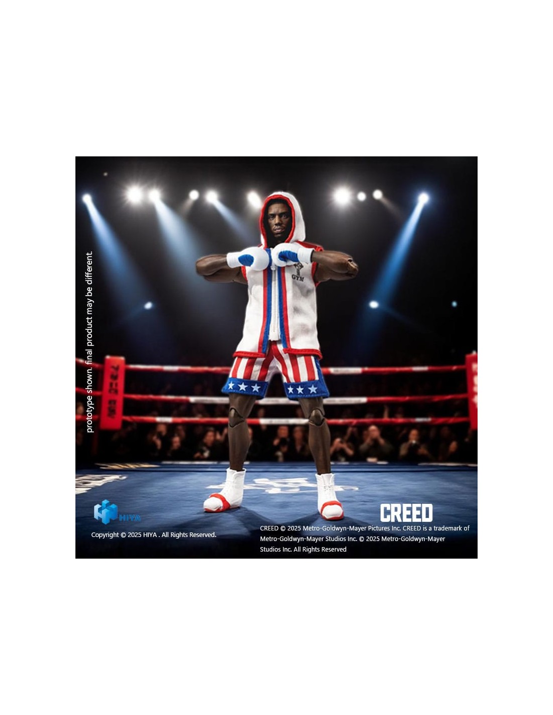 Questa nuovissima action figure in scala 1/12 è alta 16 cm e ricrea fedelmente l'iconico aspetto di Adonis del film. Caratterizzata da un'espressione seria e un fisico muscoloso e scolpito, la figura indossa pantaloncini da boxe a stelle e strisce, abbinati a moderne sneaker e calzini sportivi bianchi, riecheggiando l'eredità del padre. Il design fonde simbolismo classico e stile contemporaneo, catturando l'identità di Adonis sia come tributo che come nuovo campione.