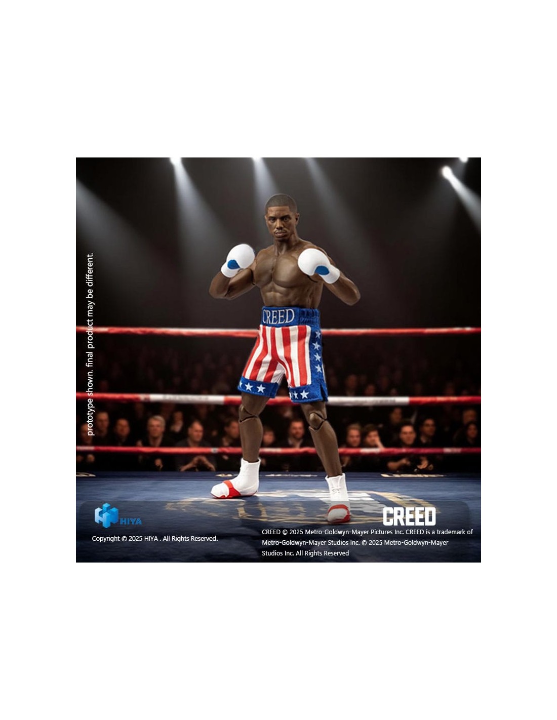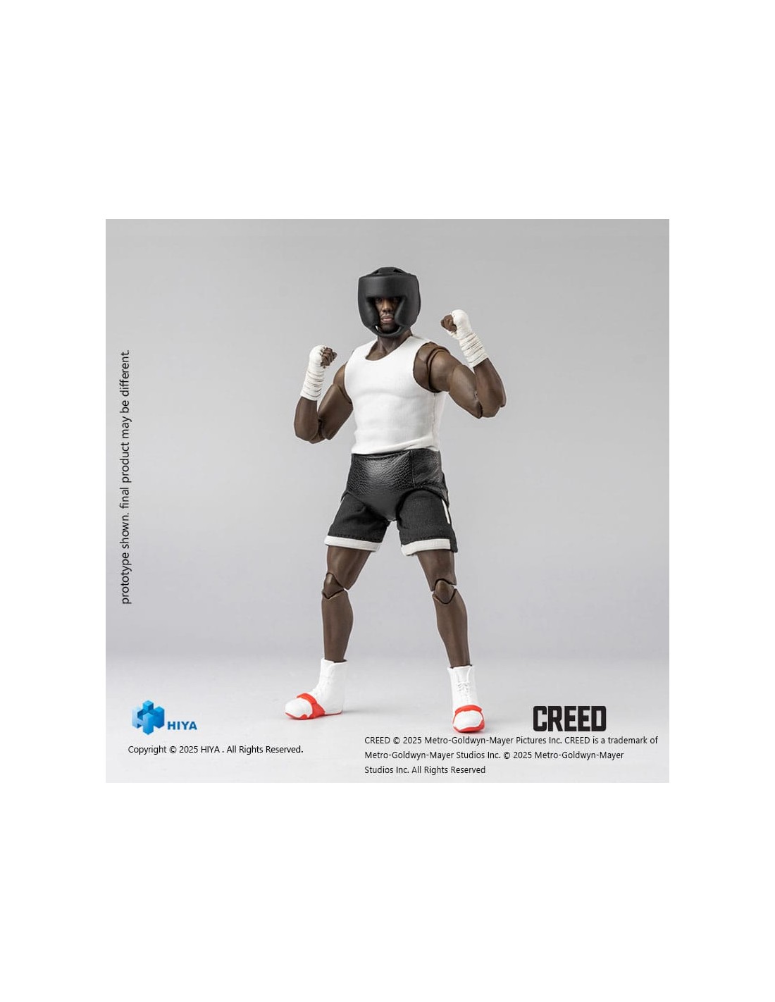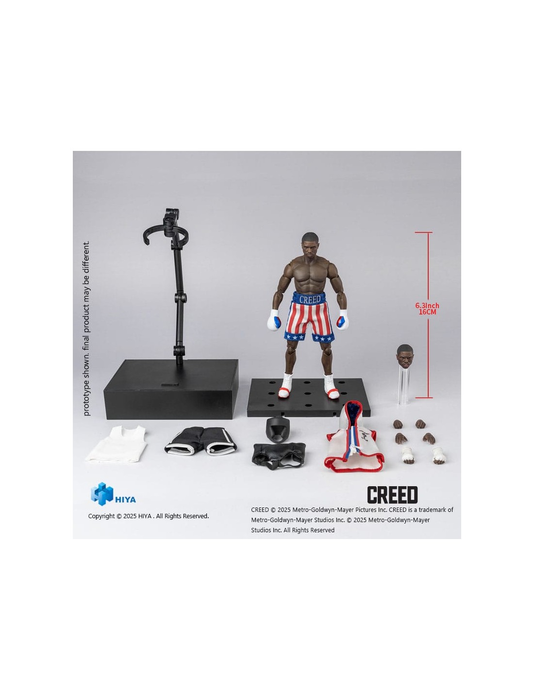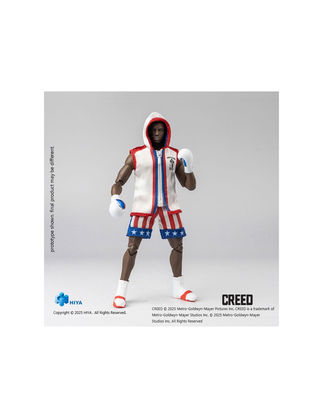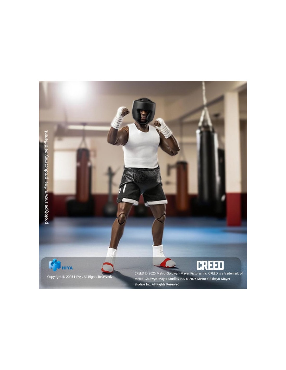 Questa nuovissima action figure in scala 1/12 è alta 16 cm e ricrea fedelmente l'iconico aspetto di Adonis del film. Caratterizzata da un'espressione seria e un fisico muscoloso e scolpito, la figura indossa pantaloncini da boxe a stelle e strisce, abbinati a moderne sneaker e calzini sportivi bianchi, riecheggiando l'eredità del padre. Il design fonde simbolismo classico e stile contemporaneo, catturando l'identità di Adonis sia come tributo che come nuovo campione.