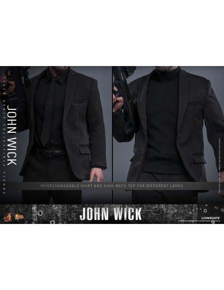 Il costume, finemente confezionato, mette in risalto il look total black distintivo di John Wick. Il suo abbigliamento include un abito, camicia, cravatta, top a collo alto, cintura con due fondine per pistola e una doppia tasca per caricatori, pantaloni, calzini e scarpe. John Wick è armato per qualsiasi missione, e include una pistola con carrello a rastrelliera, silenziatore e caricatore rimovibili; una pistola sub-compatta con carrello a rastrelliera e caricatore rimovibili; un fucile d'assalto con diverse parti regolabili, tra cui mirini, impugnatura, calcio e leva di armamento; un fucile da cecchino con bipiede scorrevole, mirino telescopico e otturatore estraibile; un fucile a pompa dotato di mirino olografico scorrevole; e un coltello da combattimento. Il set include anche l'iconica matita, notoriamente nota come lo strumento che avrebbe usato per eliminare tre uomini.