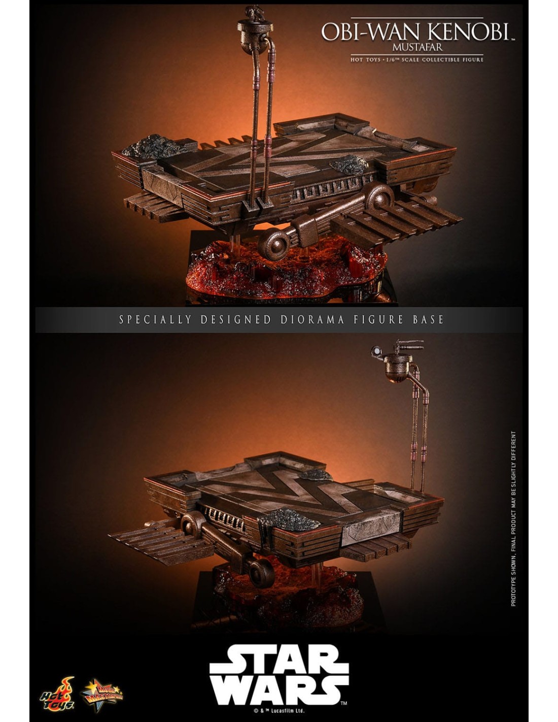 La statuetta di Star Wars indossa un costume finemente sartoriale applicato con effetti di usura per catturare l'intensità del feroce duello su Mustafar. Il suo completo include un tabarro, una tunica esterna e una sottotunica, il tutto legato in vita con un obi e una cintura multiuso dettagliata, completato da pantaloni e stivali lunghi. Sono incluse nove mani intercambiabili e lame di spada laser blu con impugnatura illuminata a LED e non illuminata per un'azione dinamica. La figura è esposta su una base diorama appositamente progettata con una piattaforma repulsiva ed effetti di lava che riproducono il paesaggio vulcanico di Mustafar, consentendo ai collezionisti di ricreare l'iconica scena del duello tra Obi-Wan Kenobi e Anakin Skywalker.