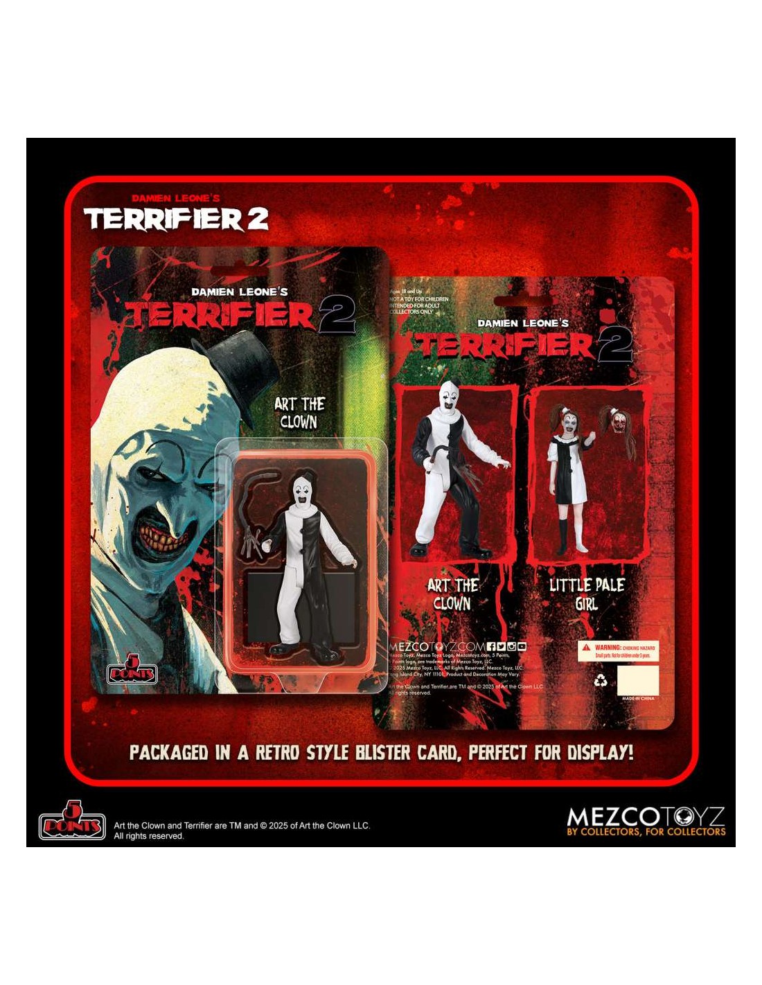 Il set include le figure di Art the Clown e Little Pale Girl, ognuna con i propri accessori e ognuna nel suo blister. Da non perdere!