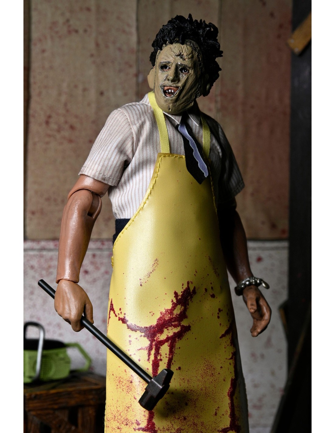 Indossando il suo classico grembiule giallo con camicia a righe, questa action figure completamente articolata da 20 cm include la sua famigerata motosega, una mano alternativa, un lungo martello e un braccialetto come accessori.