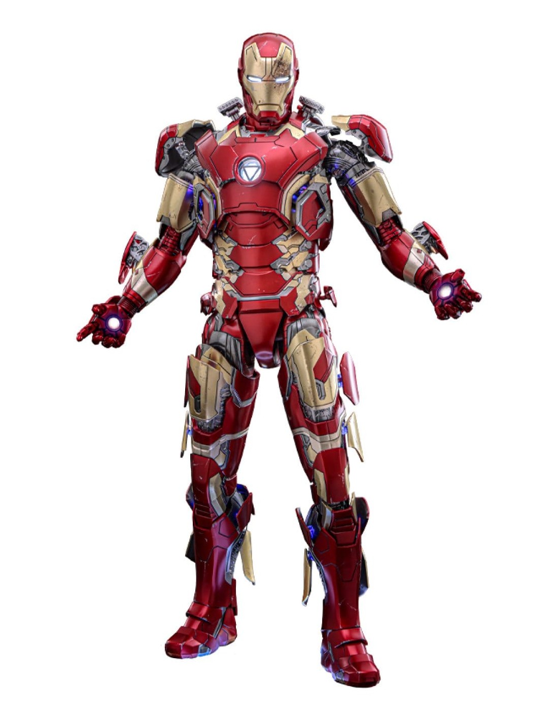 Il head sculpt di Tony Stark è incredibilmente realistico, con occhi mobili e pittura battle-damaged, mentre la testa con casco include LED e due faceplate intercambiabili. L’armatura in diecast vanta luci LED negli occhi, repulsori, arc reactor e retro, con illuminazione blu laterale su torace, braccia e gambe, alimentata tramite USB-C.