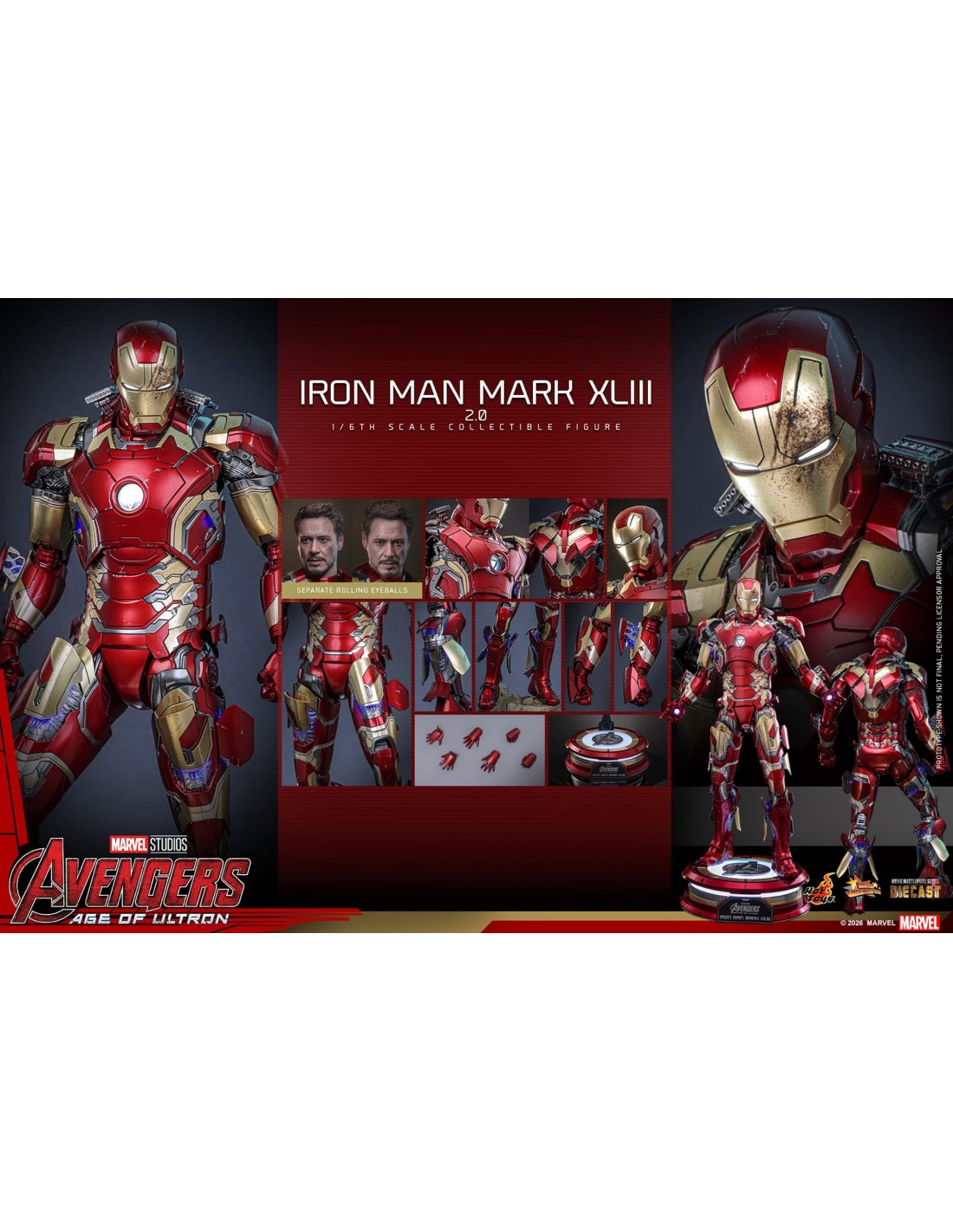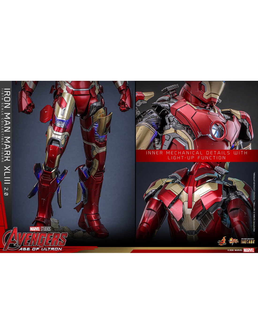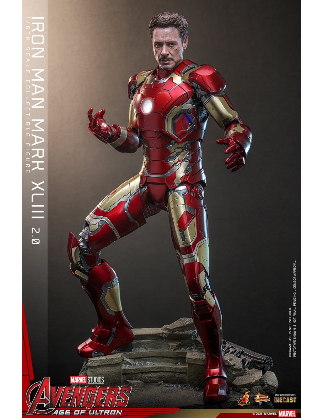 Colleziona la figurina Iron Man Mark XLIII (2.0) Sixth Scale: LED negli occhi, repulsori e arc reactor, armatura diecast rossa e oro, accessori intercambiabili e base Avengers. Perfetta per esposizione e regalo fan Marvel.
