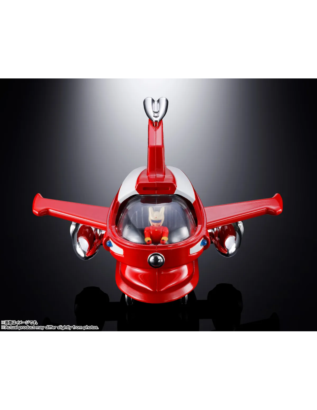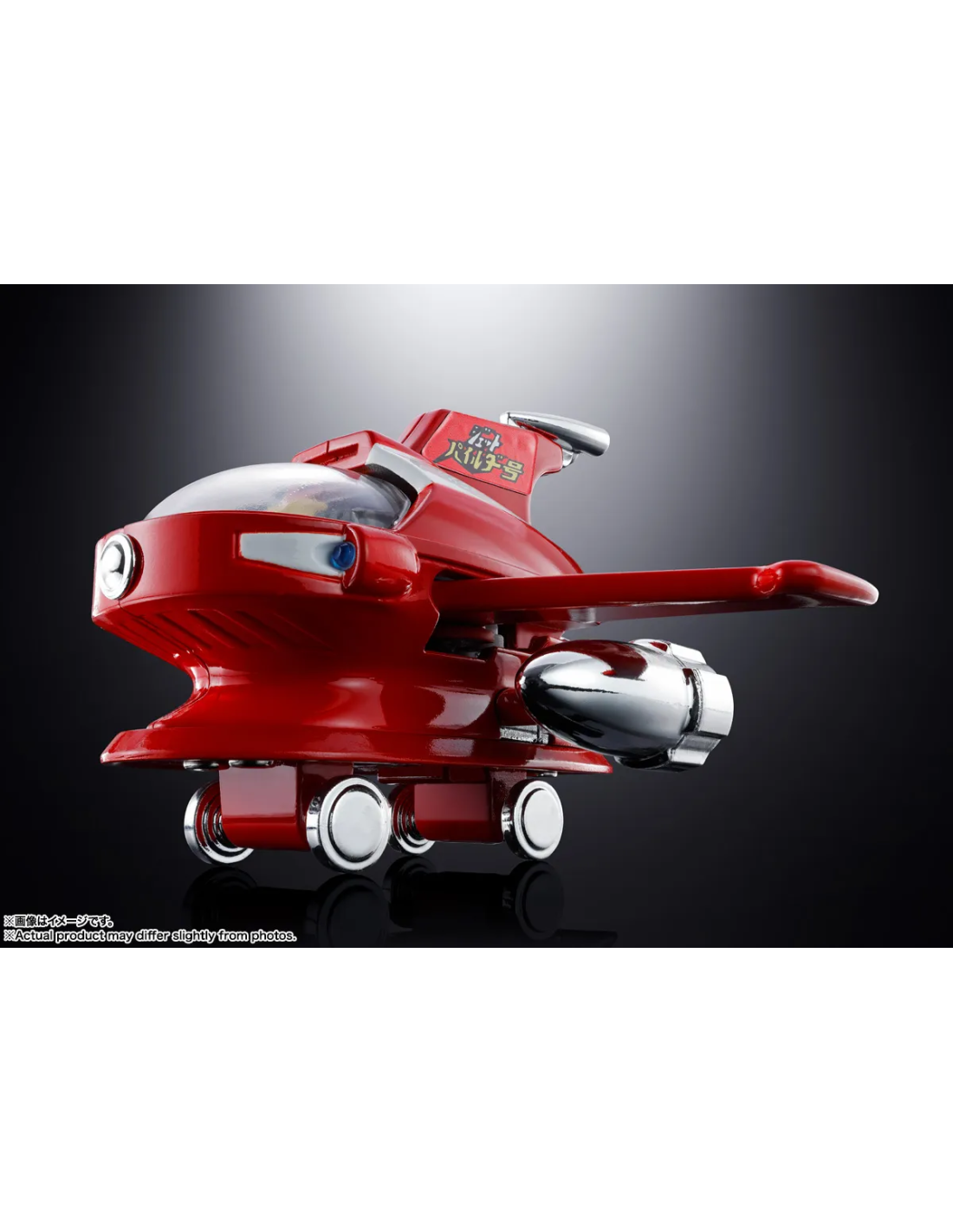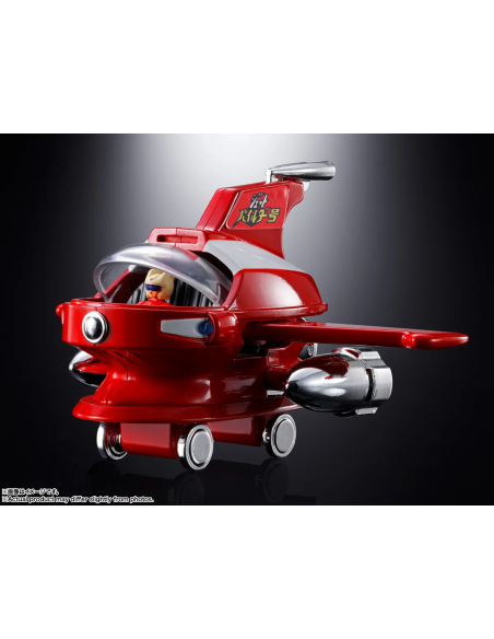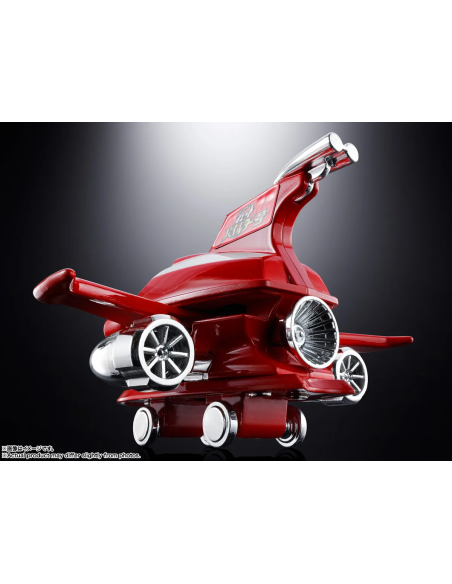 Le tre prese d’aria posteriori e i doppi ugelli laterali in placcatura argentata si combinano magnificamente con il rosso brillante della fusoliera. Le ali cremisi e i motori laterali sono retrattibili, permettendo la trasformazione completa per integrarsi sulla testa di Mazinger Z (venduto separatamente).