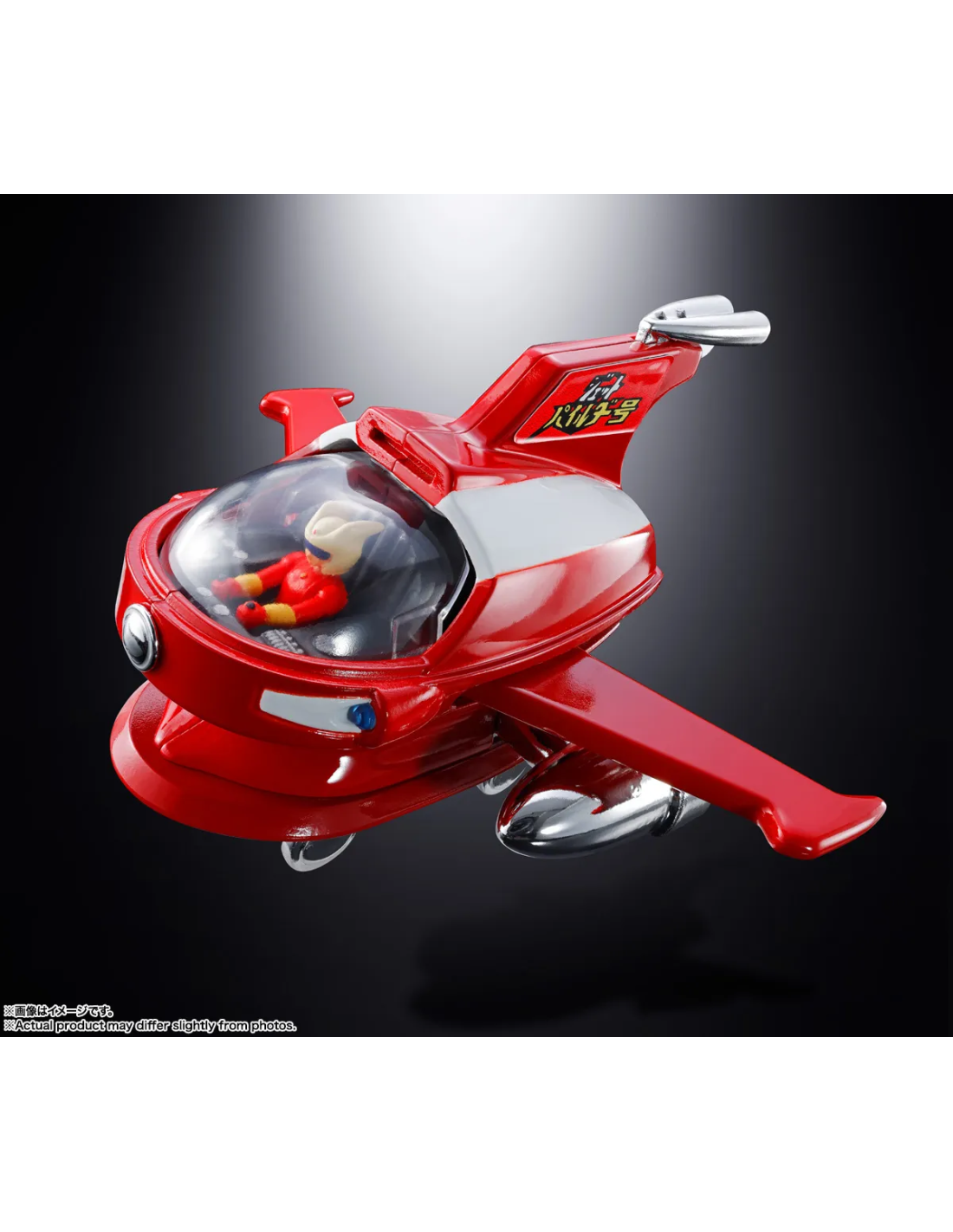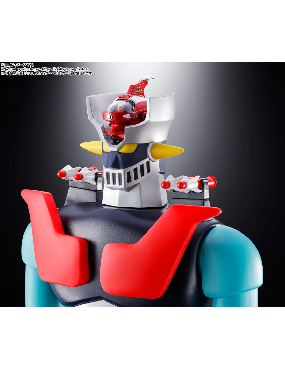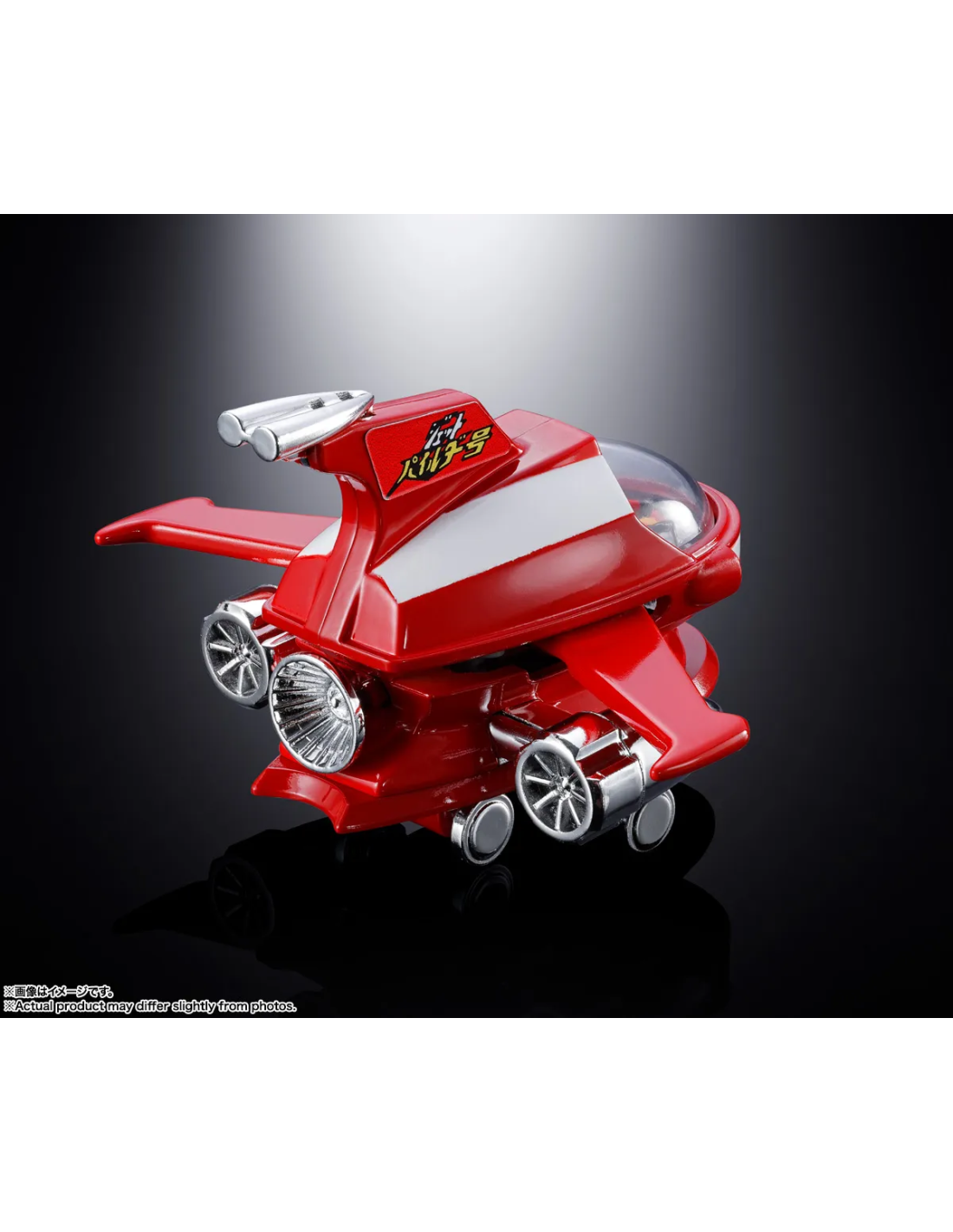 Le tre prese d’aria posteriori e i doppi ugelli laterali in placcatura argentata si combinano magnificamente con il rosso brillante della fusoliera. Le ali cremisi e i motori laterali sono retrattibili, permettendo la trasformazione completa per integrarsi sulla testa di Mazinger Z (venduto separatamente).