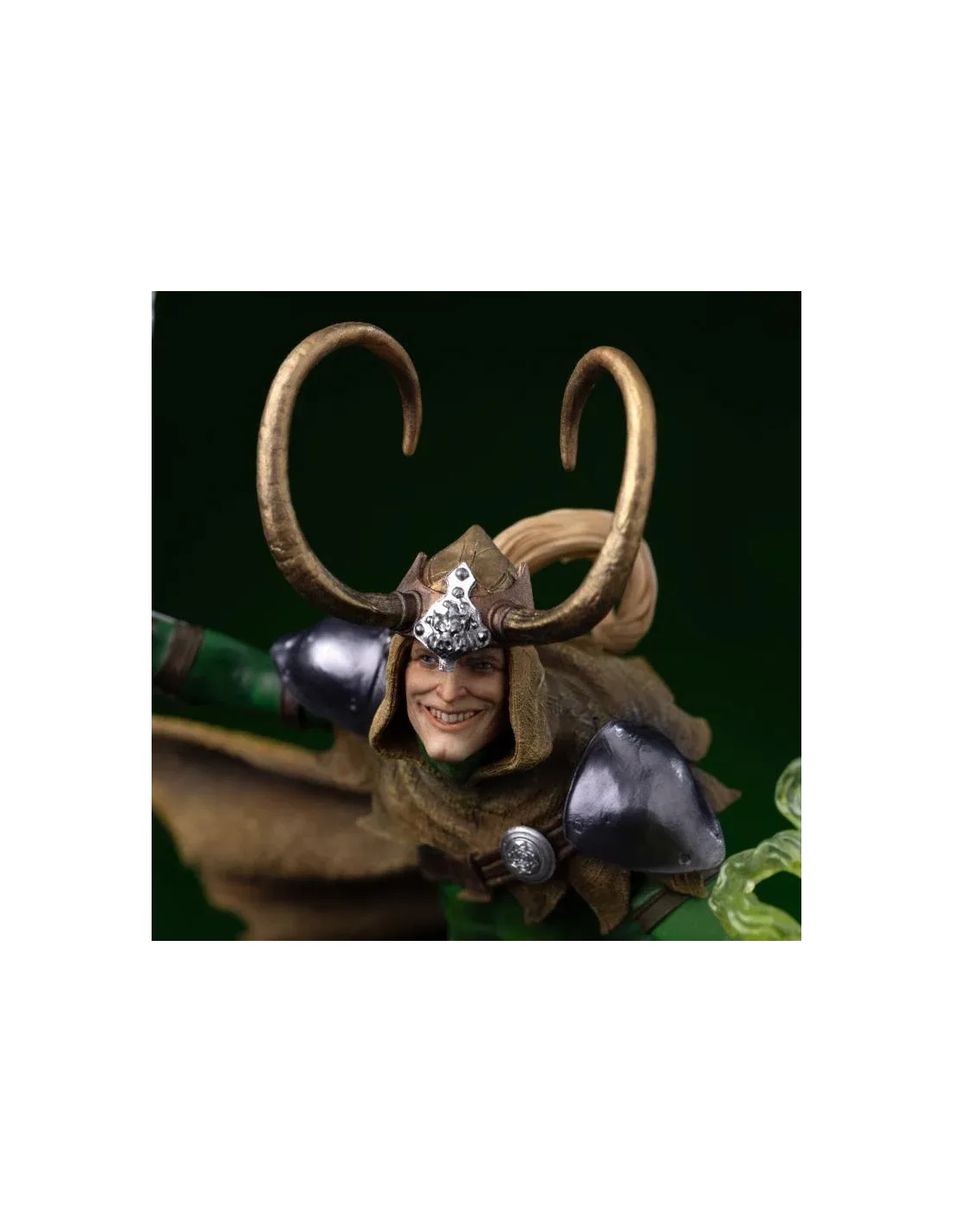 Questa statua da collezione raffigura Loki in una posa dinamica ed elegante, che trasmette perfettamente la sua sicurezza e il suo carattere provocatorio. La composizione mette in risalto il costume iconico del personaggio, ricco di dettagli e texture finemente scolpite.