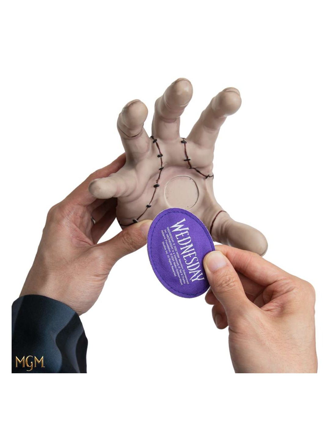 La piccola area circolare nel palmo della mano è magnetica e attrae la toppa viola con il logo "Mercoledì", anch'essa un magnete.