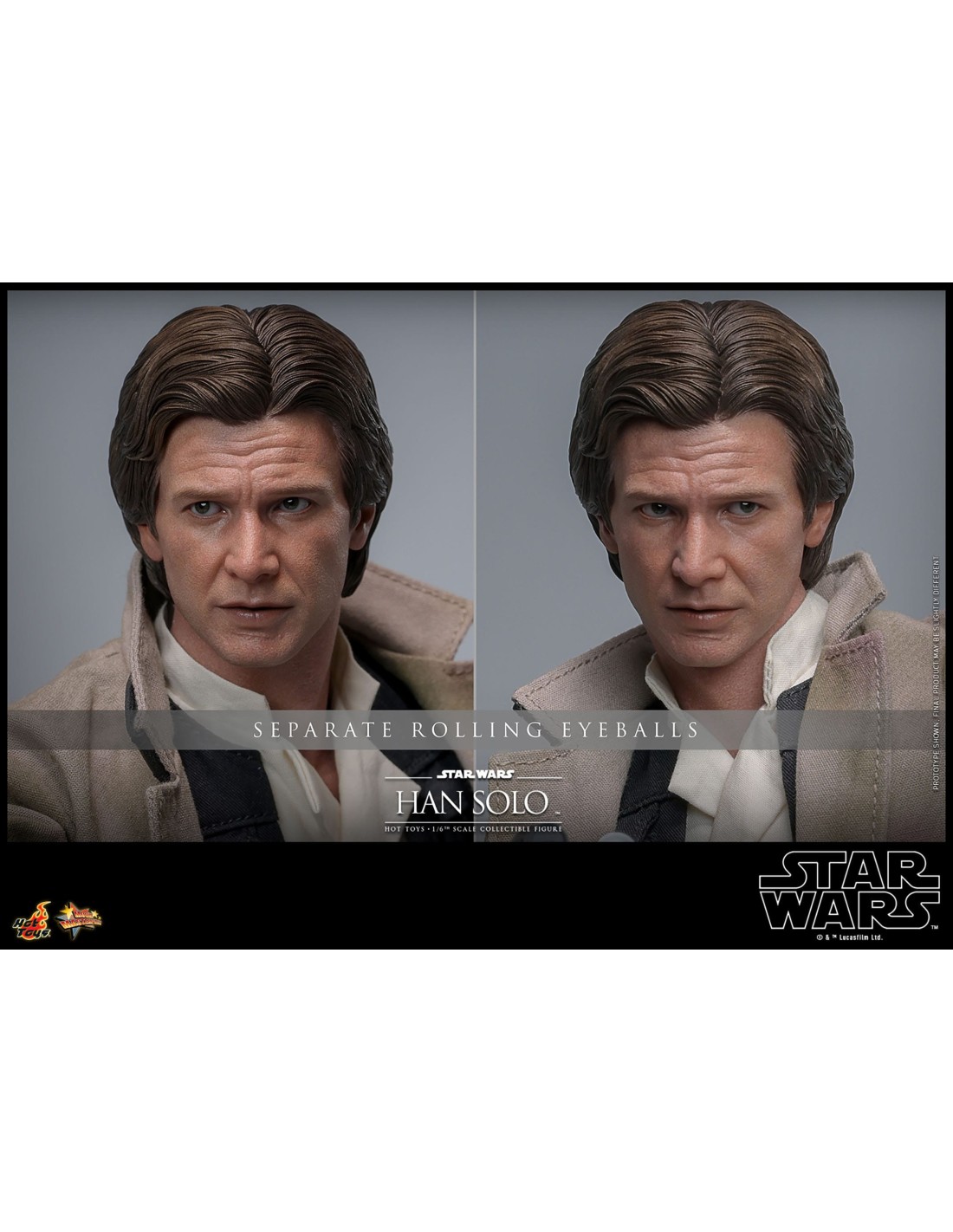 Alta circa 30 cm, la figure si distingue per il head sculpt realistico con sistema di occhi rotanti, che consente un’espressività superiore rispetto alle versioni tradizionali. I lineamenti del volto, la texture della pelle e l’acconciatura sono riprodotti con estrema precisione, offrendo una somiglianza convincente con il personaggio interpretato da Harrison Ford.